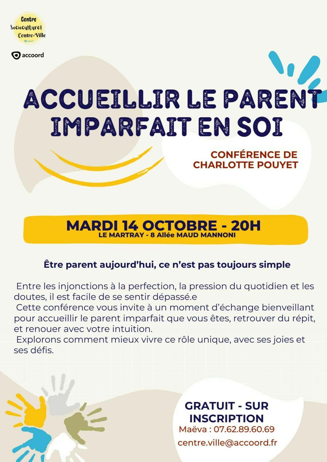 Ainsi, dans le cadre de la Semaine d’Information sur la Santé Mentale, le CSC du Centre-ville organise une conférence intitulée « Accueillir le parent imparfait en soi » le mardi 14 octobre à 20h au CSC Centre-ville (Matray, 8 allée Maud Mannoni).