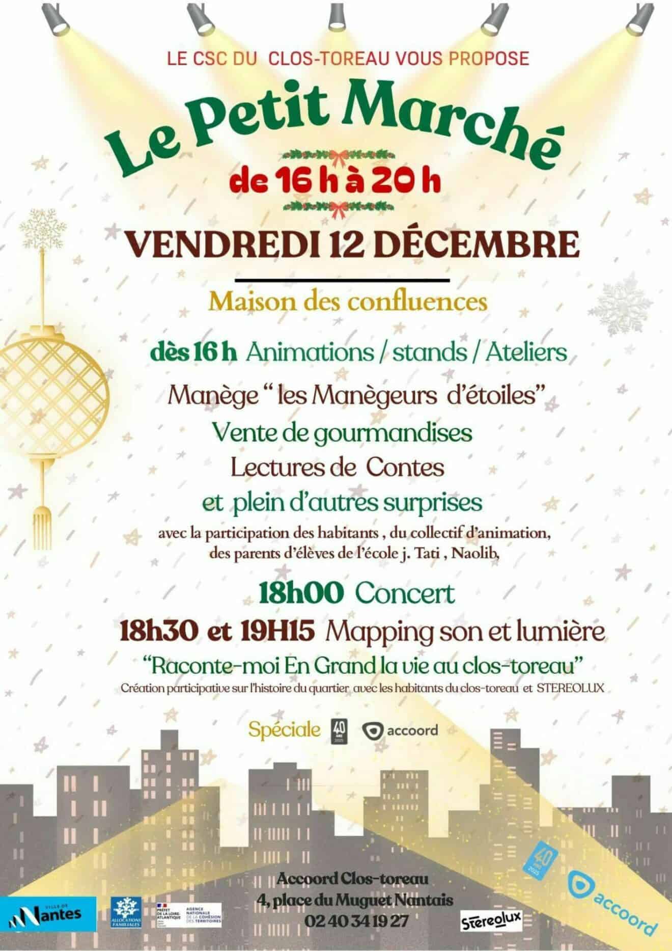 Marché de Noël, de nombreuses animations, ventes de gourmandises et petits cadeaux. Suivi de lecture le contes et d’un concert proposé par le Stéréolux. Enfin, projection du projet mapping « Raconte moi en grand la vie au Clos-Toreau », sur les immeubles du quartier, réalisé conjointement par les habitants, les ados, et les enfants de l’accueil de loisir, en partenariat avec le Stéréolux.