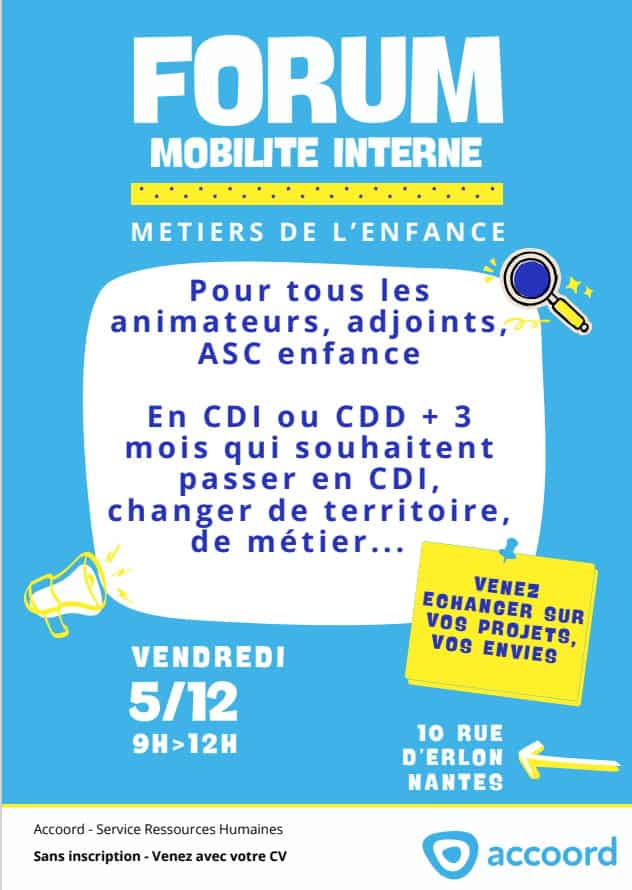 Nous vous invitons à participer au Forum de mobilité interne – métiers de l’enfance, un temps fort dédié à la mobilité interne et aux opportunités professionnelles au sein de notre Association.